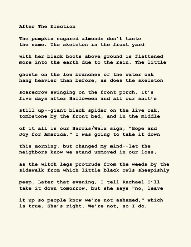 Jamey Jones is the author of morning coffee from the other side (West Florida Literary Federation, 2021) In The Key of Clothespin (Fell Swoop, 2021), Light Box Over My Head, (3rd Floor Apartment Press, 2024), and Under The Big Span of Small Regards (Spuyten Duyvil, 2024). He is the faculty editor of Hurricane Review, the literary journal of Pensacola State College, where he teaches English, Literature, and Poetry.