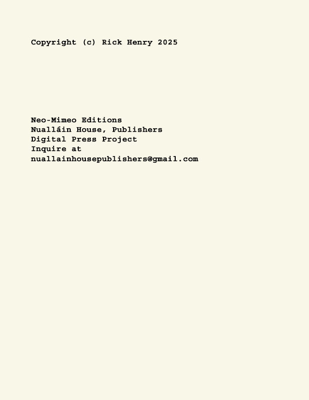 Rick Henry’s most recent publication is Bottoms, a stage play. The novella, Colleen’s Count and the epistolary novel Letters (1855), are set in the fictional town of Homer, NY. His other books include: Snow Fleas (a Reverie) and Then (54 text blocks), both from ANC. Just completed is The Soot Collection: 55 consensual novellas born of a brief exchange about surrealism and the erotic. Rick Henry has lived across the United States, but always returns to the sensibilities, landscapes, and histories of upstate New York.