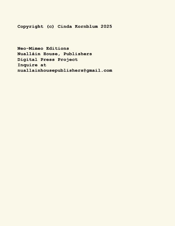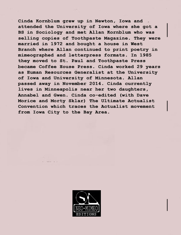 Cinda Kornblum grew up in Newton, Iowa and attended the University of Iowa where she got a BS in Sociology and met Allan Kornblum who was selling copies of Toothpaste Magazine. They were married in 1972 and bought a house in West Branch where Allan continued to print poetry in mimeographed and letterpress formats. In 1985 they moved to St. Paul and Toothpaste Press became Coffee House Press. Cinda worked 29 years as Human Resources Generalist at the University of Iowa and University of Minnesota. Allan passed away in November 2014. Cinda currently lives in Minneapolis near her two daughters, Annabel and Gwen. Cinda co-edited (with Dave Morice and Morty Sklar) The Ultimate Actualist Convention which traces the Actualist movement from Iowa City to the Bay Area.