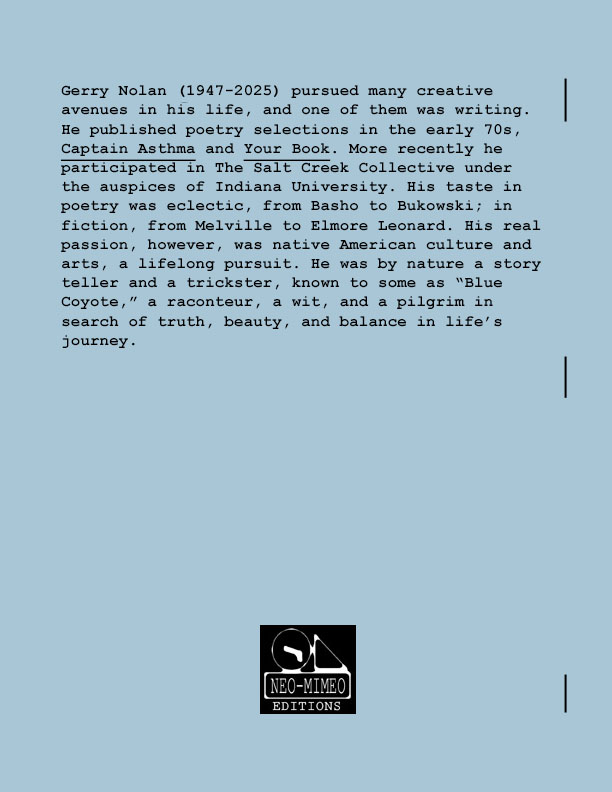 Gerry Nolan (1947-2025) pursued many creative avenues in his life, and one of them was writing. He published poetry selections in the early 70s, Captain Asthma and Your Book. More recently he participated in The Salt Creek Collective under the auspices of Indiana University. His taste in poetry was eclectic, from Basho to Bukowski; in fiction, from Melville to Elmore Leonard. His real passion, however, was native American culture and arts, a lifelong pursuit. He was by nature a story teller and a trickster, known to some as “Blue Coyote,” a raconteur, a wit, and a pilgrim in search of truth, beauty, and balance in life’s journey.