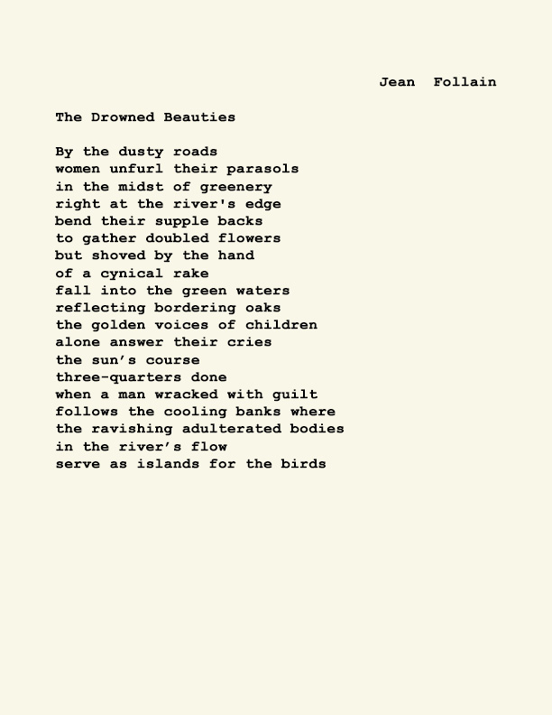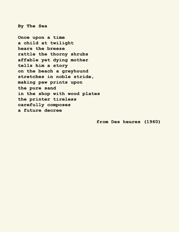 Jean Follain (1903-1971) first came to the attention of US poetry readers in W.S. Merwin’s as Transparence Of The World published in 1969. More recently a larger comprehensive selection of his work has been published by The Song Cave as Earthly, translated by Andrew Seguin. Follain is noted for his succinct haunting lyrics evocative the landscape of his native Normandy.
