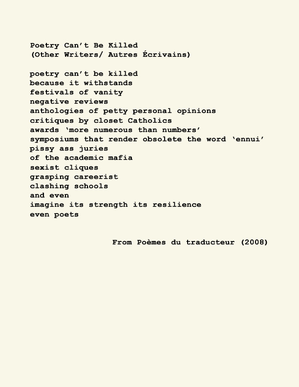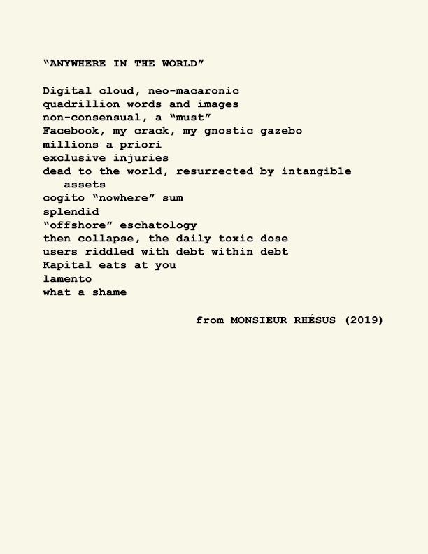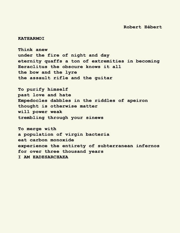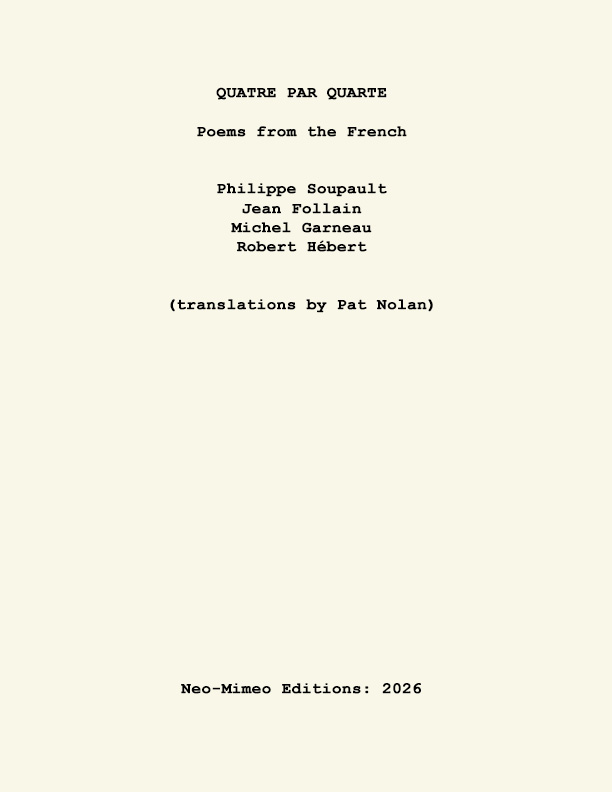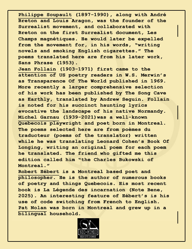 Robert Hébert is a Montreal based poet and philosopher. He is the author of numerous books of poetry and things Quebecois. His most recent book is La Légende des incarnation (Note Bene, 2025). An interesting feature of Hébert’s is his use of code switching from French to English.