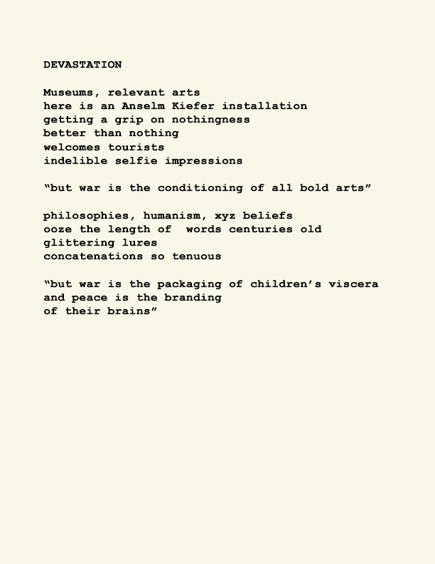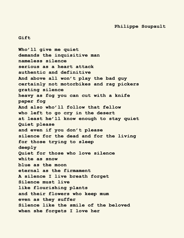 Philippe Soupault (1897-1990), along with André Breton and Louis Aragon, was the founder of the Surrealist movement, and collaborated with Breton on the first Surrealist document, Les Champs magnétiques. He would later be expelled from the movement for, in his words, “writing novels and smoking English cigarettes.” The poems translated here are from his later work, Sans Phrase (1953).
