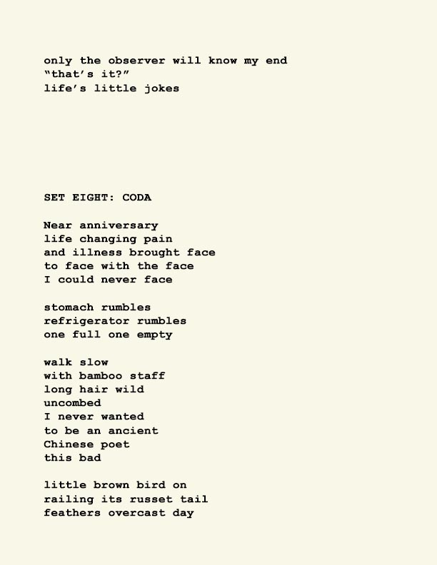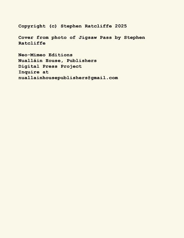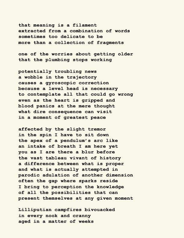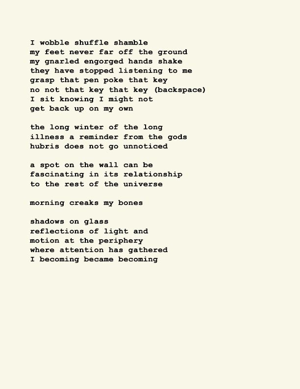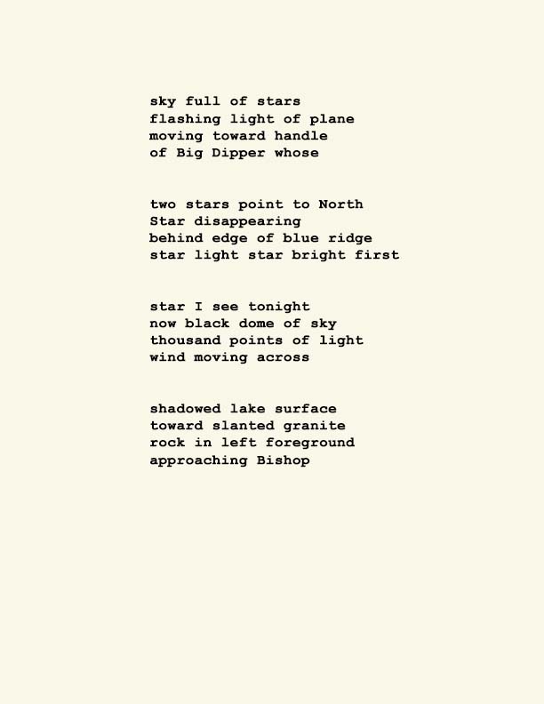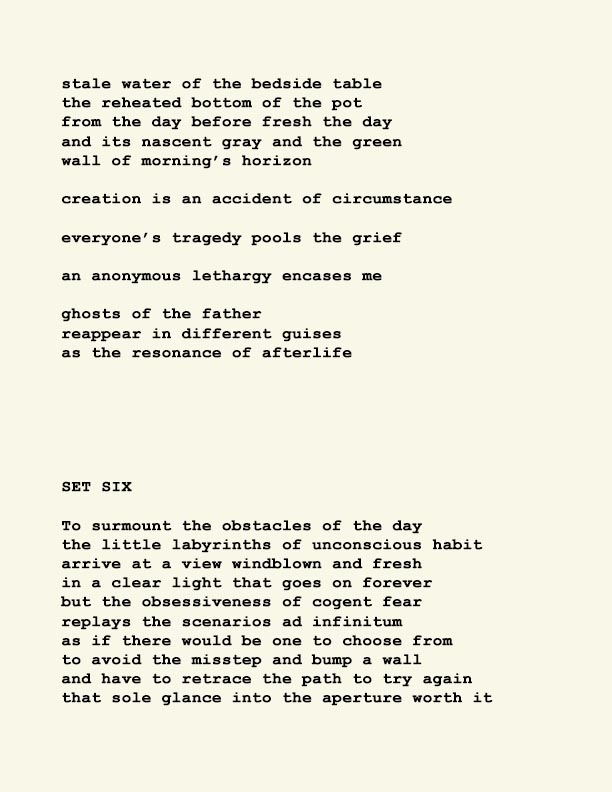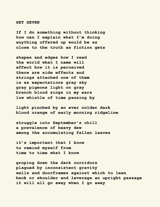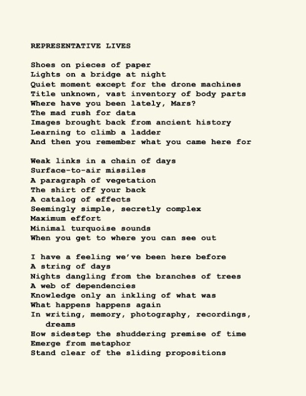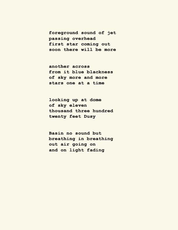 Stephen Ratcliffe is the author of more than 25 books of poetry, including m o m e n t (Spuyten Duyvil) Black and Yellow Notebooks (BlazeVox), Rocks and More Rocks (Cuneiform), Painting (Chax) and Selected Days (Counterpath) which won the SF State Poetry Center Book Award, as well as a collection of his correspondence, Barbara Guest : Stephen Ratcliffe : Letters (Chax). He has also written 3 books of literary criticism, Reading the Unseen: (Offstage) Hamlet, Listening to Reading, and Campion: On Song. His ongoing series of eight 1,000-page books written in 1,000 consecutive days are at Editions Eclipse (http://eclipsearchive.org/projects/editions.html) and his series of daily poems-plus-photographs are at Temporality (http://stephenratcliffe.blogspot.com). Publisher of Avenue B books and Emeritus Professor at Mills College, he has lived in Bolinas since 1973.