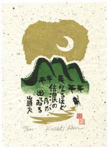 “I had the idea of making Buddhist inspired prints featuring what I call faux koans (“Kicked a clump of dirt—my return address” or “The more you know the more you know”) since historically some of the earliest Japanese prints were devotional depictions of Buddhist saints or precepts sold to pilgrims traveling to shrines and temples. They are faux koans in the sense that they imply an ironic intent and emphasize mystification rather than clarification. I was particularly impressed by the seemingly effortless and spontaneous prints produced by contemporary artist Kan Kozaki working in the spirit of Munakata, and whose techniques I sought to appropriate. Many of Kozaki’s prints feature a haiku by the 20th Century haiku poet Santoka which also encouraged me to feature texts with my images.” The Smoking Poets prints are his take on Kabuki actor portrait prints.