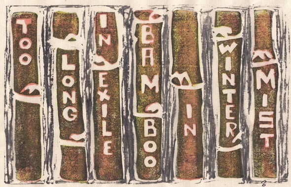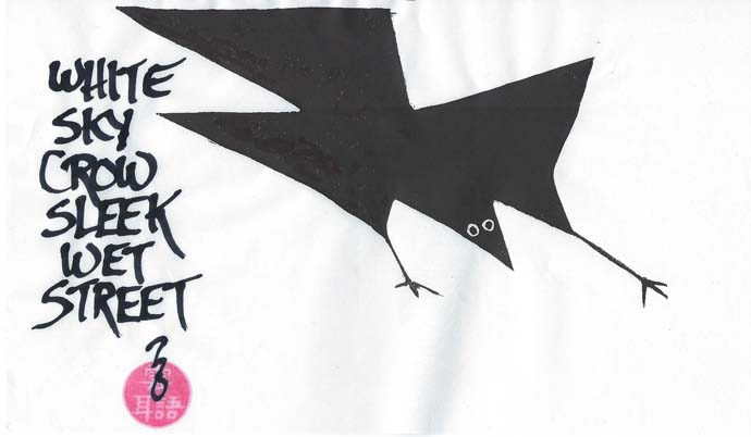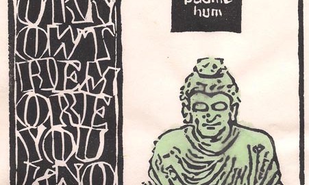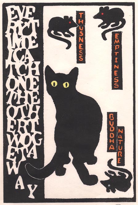 “I had the idea of making Buddhist inspired prints featuring what I call faux koans since historically some of the earliest Japanese prints were devotional depictions of Buddhist saints or precepts sold to pilgrims traveling to shrines and temples. They are faux koans in the sense that they imply an ironic intent and emphasize mystification rather than clarification.” –Pat Nolan