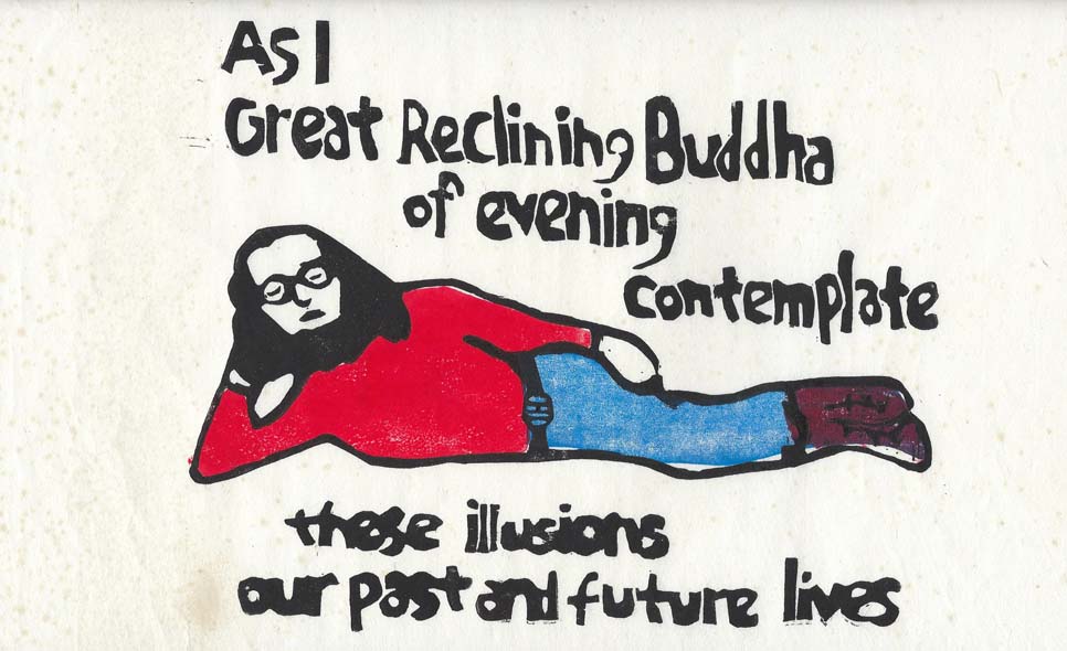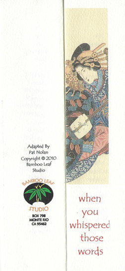 These limited edition books were published under various whimsical imprints using found, recycled, and synthetic/commercial materials and innovative methods including lino cut, stencil, mylar, rubber stamp, tee shirt transfer, and chine collé. The books are bound in assorted Chinese/Japanese side style bindings including Yamato ribbon binding. Binding strips and endpapers on some editions are imported Japanese silkscreen paper or a natural dyed momogami. Included are also a few fan fold items in the surimono style of literary ephemera. Editions never number more than 36, often as few as 12. The letterpress broadsides were printed at North Bay Letterpress Arts in Sebastopol, CA.