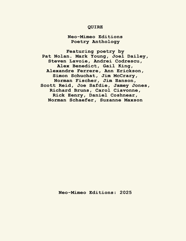 Neo-Mimeo Editions has posted 24 chapbooks since the beginning of 2025. Packages of 24 mimeograph stencils are sold as quires. Quire is a little anthology collecting a poem or a representative page from each of the editions published in the same format, as a slideshow, and as a printable pdf file. Many thanks to the authors for participating in this ongoing project.