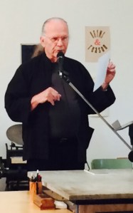 I first came to print making through an avid interest in Ukiyo-e prints, in the process amassing a large number of monographs, museum catalogs, and anthology representations of floating world artists who were popular in Japan in the 18th to the late 19th century. The subdued palette of basic colors reminded me of the color funny papers and comic books that were a consuming interest when I was a youngster. The more I learned about the art of Japanese print making, the more I came to appreciate 20th Century artists and the powerful simplicity of black and white prints in the hands of masters like Munakata, Unichi, and Okuyama. My by-now obsession with Japanese prints was kicked up a notch when I began collecting affordable reproductions of the Edo masters as well as original work by contemporary artists. The next level was to try my hand at making prints of my own. I had better luck carving linoleum blocks than I did wood and took the path of least resistance. I knew I wanted to work with and/or adapt the Japanese motifs I was familiar with. I had the idea of making Buddhist inspired prints featuring original homilies (“Kicked a clump of dirt – my return address”) since some of the earliest Japanese prints were devotional prints sold to pilgrims traveling to various shrines and temples. I also wanted to attempt portraits of literary personages, poets primarily, in the manner of Kabuki actor prints. My emphasis is black and white, printing with water soluble ink on mulberry paper, and, in most instances, letting the uncarved portions of the block define the picture plane. The blocks are printed by hand using a variety of barens and multiple inkings.