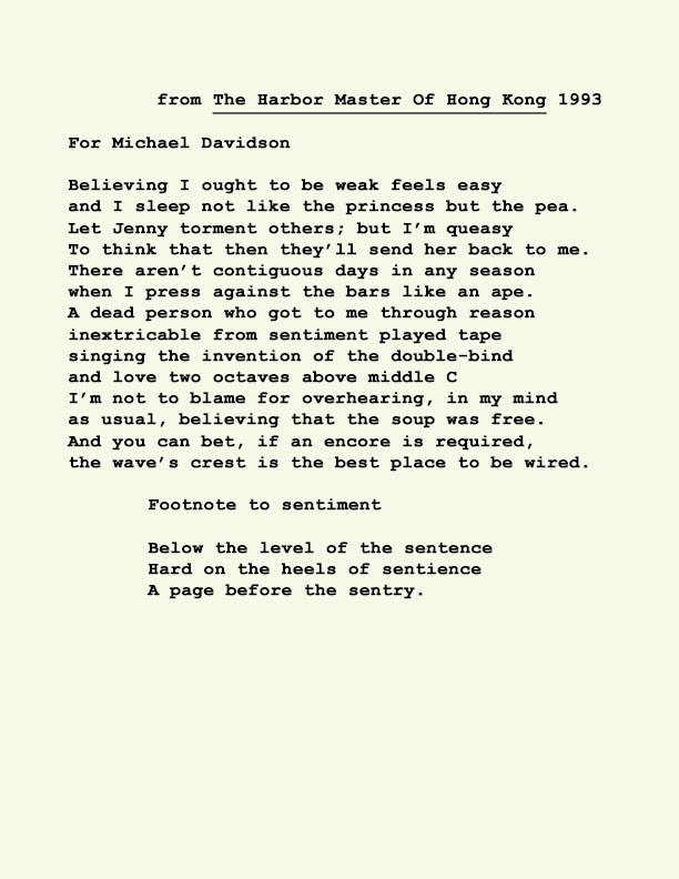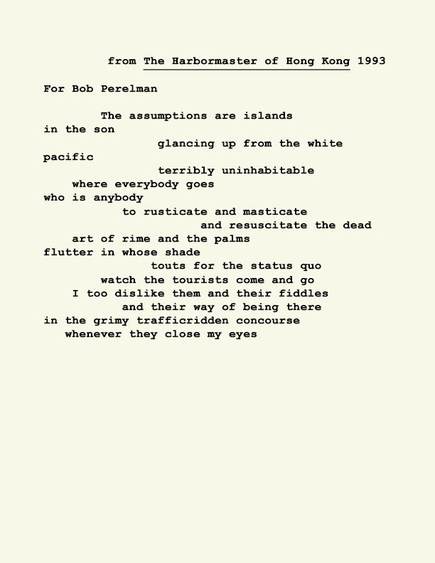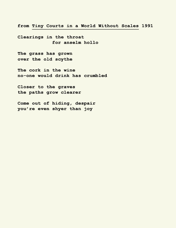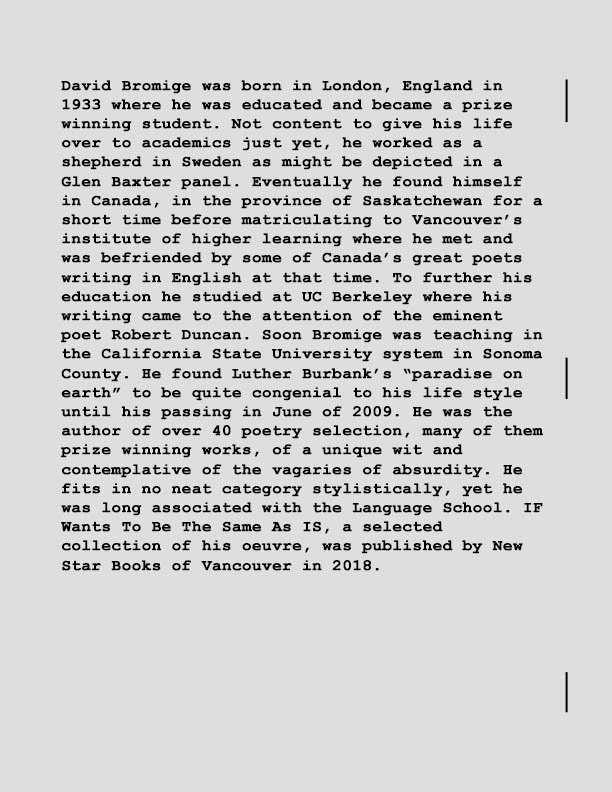 David Bromige was born in London, England in 1933 where he was educated and became a prize winning student. Not content to give his life over to academics just yet, he worked as a shepherd in Sweden as might be depicted in a Glen Baxter panel. Eventually he found himself in Canada, in the province of Saskatchewan for a short time before matriculating to Vancouver’s institute of higher learning where he met and was befriended by some of Canada’s great poets writing in English at that time. To further his education he studied at UC Berkeley where his writing came to the attention of the eminent poet Robert Duncan. Soon Bromige was teaching in the California State University system in Sonoma County. He found Luther Burbank’s “paradise on earth” to be quite congenial to his life style until his passing in June of 2009. He was the author of over 40 poetry selection, many of them prize winning works, of a unique wit and contemplative of the vagaries of absurdity. He fits in no neat category stylistically, yet he was long associated with the Language School. IF Wants To Be The Same As IS, a selected collection of his oeuvre, was published by New Star Books of Vancouver in 2018.