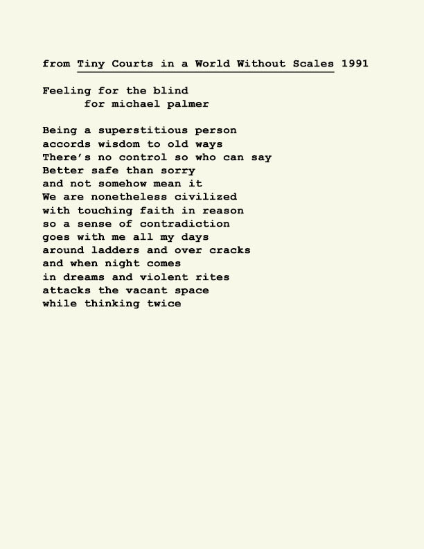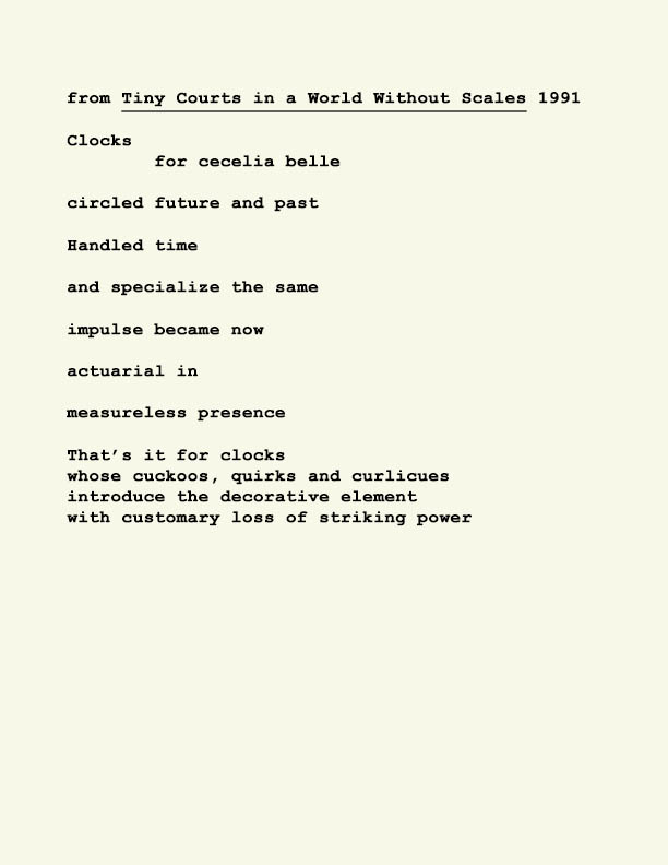 Stephen Ratcliffe is the author of more than 25 books of poetry, including m o m e n t (Spuyten Duyvil) Black and Yellow Notebooks (BlazeVox), Rocks and More Rocks (Cuneiform), Painting (Chax) and Selected Days (Counterpath) which won the SF State Poetry Center Book Award, as well as a collection of his correspondence, Barbara Guest : Stephen Ratcliffe : Letters (Chax). He has also written 3 books of literary criticism, Reading the Unseen: (Offstage) Hamlet, Listening to Reading, and Campion: On Song. His ongoing series of eight 1,000-page books written in 1,000 consecutive days are at Editions Eclipse (http://eclipsearchive.org/projects/editions.html) and his series of daily poems-plus-photographs are at Temporality (http://stephenratcliffe.blogspot.com). Publisher of Avenue B books and Emeritus Professor at Mills College, he has lived in Bolinas since 1973.